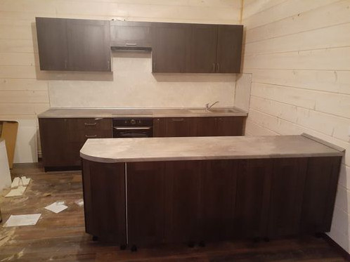 Кухня с барной стойкой из натурального дерева , массив сосны , цвет венге 3 , мебель изготовлена по индивидуальному проекту.